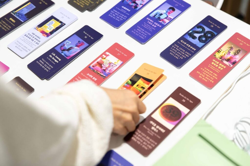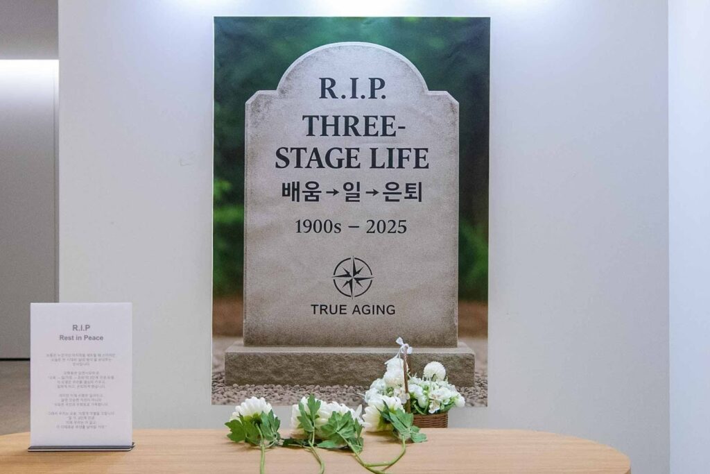 이번 컨퍼런스는 시작부터 남달랐습니다. 참여자들은 입장과 동시에 자신의 ‘나이’를 밝혀야 했는데요. 나이대별 추천 도서와 글귀가 담긴 책갈피를 증정하기 위한 깜짝 이벤트였죠. 이는 나이를 숫자로만 여기는 대신, 지금 내가 서 있는 삶의 단계를 자연스럽게 받아들이고 생각해보게 하는 뜻밖의 첫인사였습니다. 행사장 한편에는 ‘교육-일-은퇴’라는 낡은 3단계 삶의 모델과의 작별을 위한 묘비도 세워져 눈길을 끌었습니다. 참여자들은 그 앞에 국화 한 송이를 바치는 작은 퍼포먼스를 통해, 더 이상 유효하지 않은 과거의 삶의 방식에 보내는 작별 인사에 동참할 수 있었습니다.