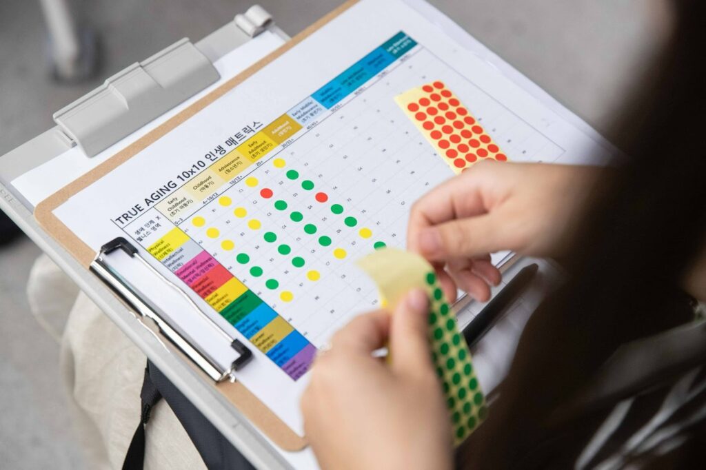 100여 명의 참여자들은 자신의 생애주기에 따른 여러 영역에 대한 만족도를 만족(초록), 보통(노랑), 좌절(빨강)을 의미하는 세 가지 색깔의 스티커로 한 칸 한 칸 채워나갔는데요. 수십 년 삶의 희로애락이 작은 사각형들 위에서 다채로운 색깔로 되살아나는 순간이었습니다.